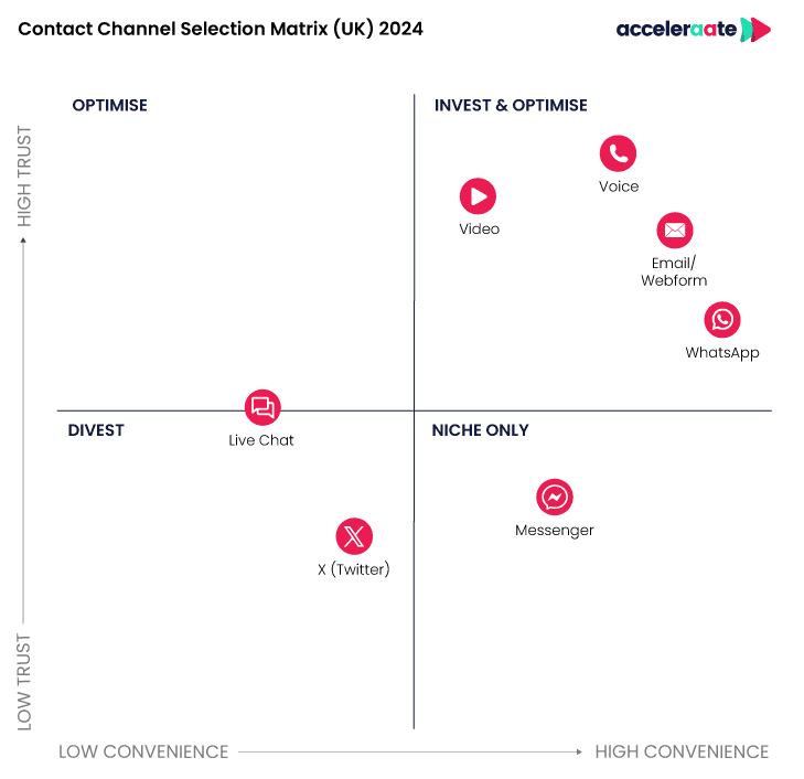 All contact channels have their strengths and weaknesses but, in our experience, some are significantly weaker than others. To illustrate this point, we’ve created a matrix plotting two of the most important elements to consider when selecting contact channels – Trust, and Convenience: